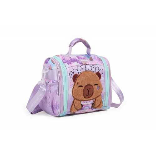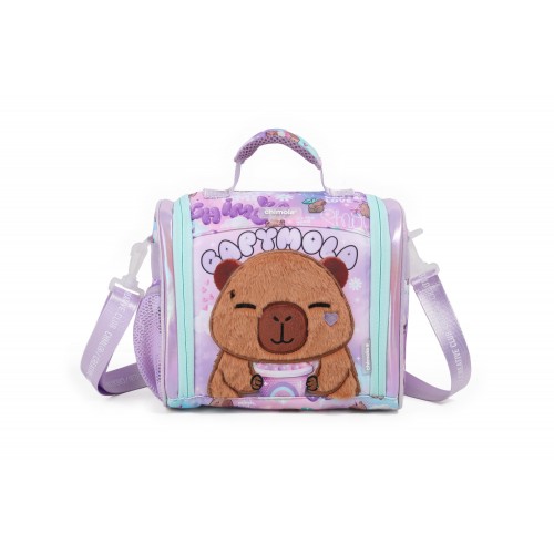 Características: Interior aislante, diseño temático Capybara, manija de mano, tira larga ajustable, cierre seguro.