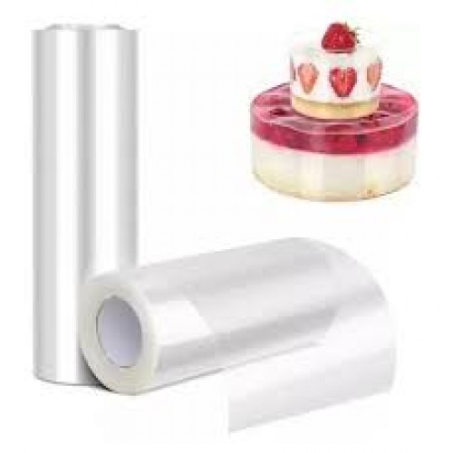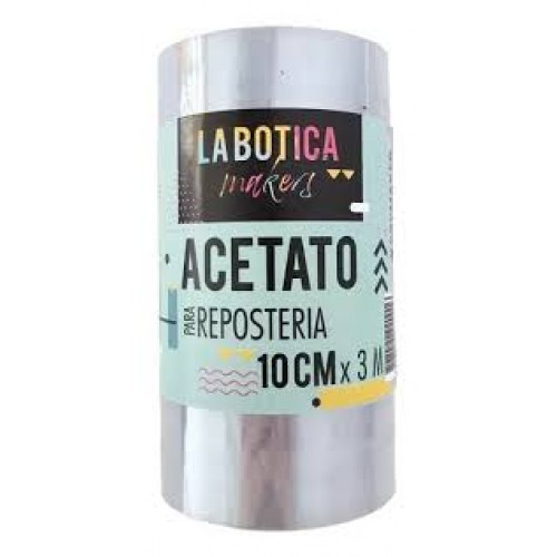 Acetato para repostería. Color: transparente. Medida: 10 cm. de alto x 3 m. El rollo de acetato se utiliza para todo tipo de tortas frías y manualidades. Ideal para dar forma al chocolate así como para montar gelatinas, semifríos, flanes, mousses, como molde de tarta. Apto uso alimenticio. Para armar y decorar la torta Glitter cake No meter en el horno.