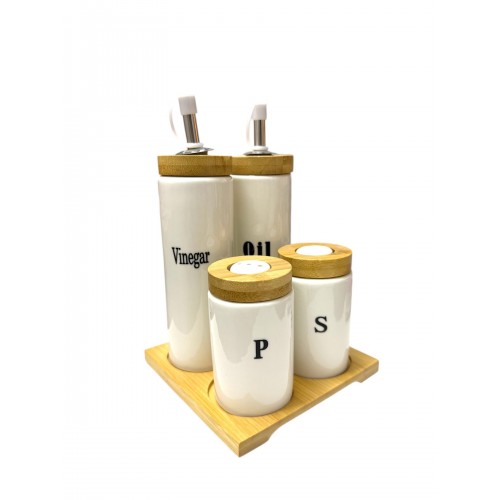 HERMOSO SET CONDIMENTERO X 4 ACEITERA-VINAGRERA-SALERO-PIMENTERO CERAMICA Y BAMBU
