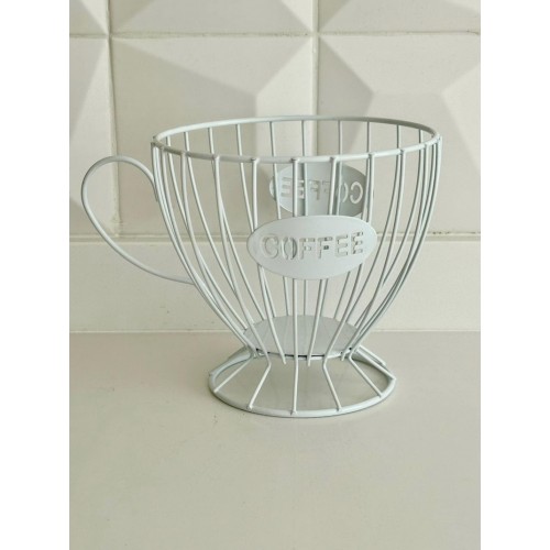 El porta cápsulas de café de alambre blanco con forma de taza es un organizador decorativo y funcional, diseñado para almacenar tus cápsulas de café de manera ordenada y a la vista en el rincón del café.