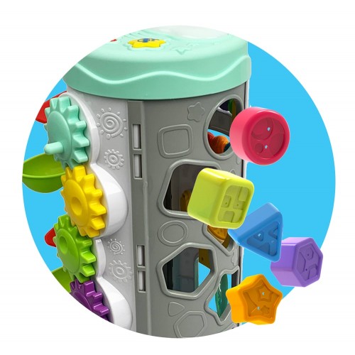 Juguete de Actividades 5 en 1: Explora esta torre musical con diferentes sonidos de instrumentos. Este juguete ofrece 5 actividades sensoriales: rodar una pelota, clasificar formas, engranajes en espiral y girar cuentas.