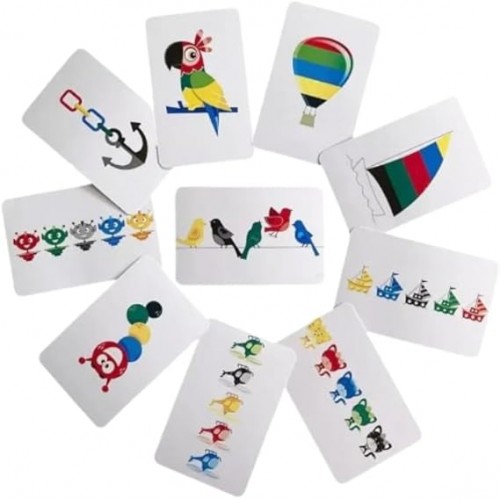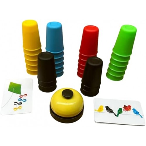 Se reparte un cubilete de cada color a cada jugador y se coloca el mazo de cartas y el timbre en el centro de la mesa. En cada turno, se revela una carta y todos deben colocar los cubiletes en el orden indicado por la carta. El primer jugador en completar el orden debe tocar el timbre para ganar la carta como recompensa. El juego continúa hasta que se acaben las cartas, y el jugador con más cartas al final será el ganador.