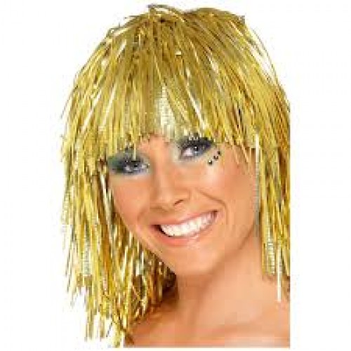 Peluca con flecos metalizados. Es de cabello corto con un flequillo ancho. Color: dorado. Se utiliza en el carnaval carioca, como accesorio para disfraces o en tandas y fiestas temáticas (por ejemplo, de pelucas, tanda de colores metalizados.
