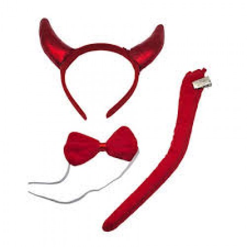 Set para disfraz de diablo o diabla. Contiene vincha, cola y moño. Ideal para accesorio de disfraces, en carnavales carioca, cumpleaños, tandas temáticas de Halloween.