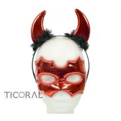 Set para disfraz de diablo. Está formado por una vincha y un antifaz. Se utiliza como accesorio para disfraces, en tandas temáticas de Halloween, en carnavales cariocas, cumpleaños y todo tipo de eventos.
