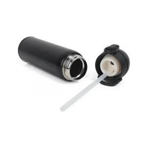 Botella térmica de acero inoxidable con tapa flip y manija. Logo impreso en stamping. Interior: acero inoxidable 304. Manija superior integrada para fácil transporte. Boquilla interior con sistema antiderrame. Mantiene líquidos calientes o fríos por más tiempo (hasta 6-8 hs aprox.). No apta para lavavajillas ni microondas.