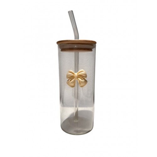 VASO DE VIDRIO 500 ML CON SORBETE TAPA DE BAMBU MOÑO BEIGE