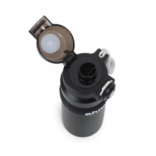 "Botella deportiva. Cuerpo libre de BPA. Tapa con traba de seguridad, boquilla oculta y botón de apertura automática. Traba de seguridad antiderrame. Manija lateral de silicona integrada. Diseño ergonómico y mate antideslizante. Apta para líquidos fríos y calientes hasta 60 °C. No apta para microondas ni lavavajillas."