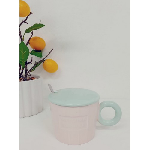TAZA DE CERAMICA CON TAPA Y CUCHARITA WELCOME THE DAY